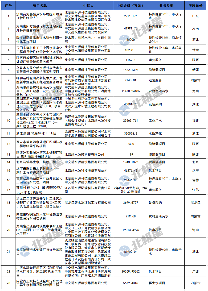 从业务类型来看,23个中标项目中涉及膜组器采购、运营服务、特许经营、EPC等,特许经营项目期限在30-40年。